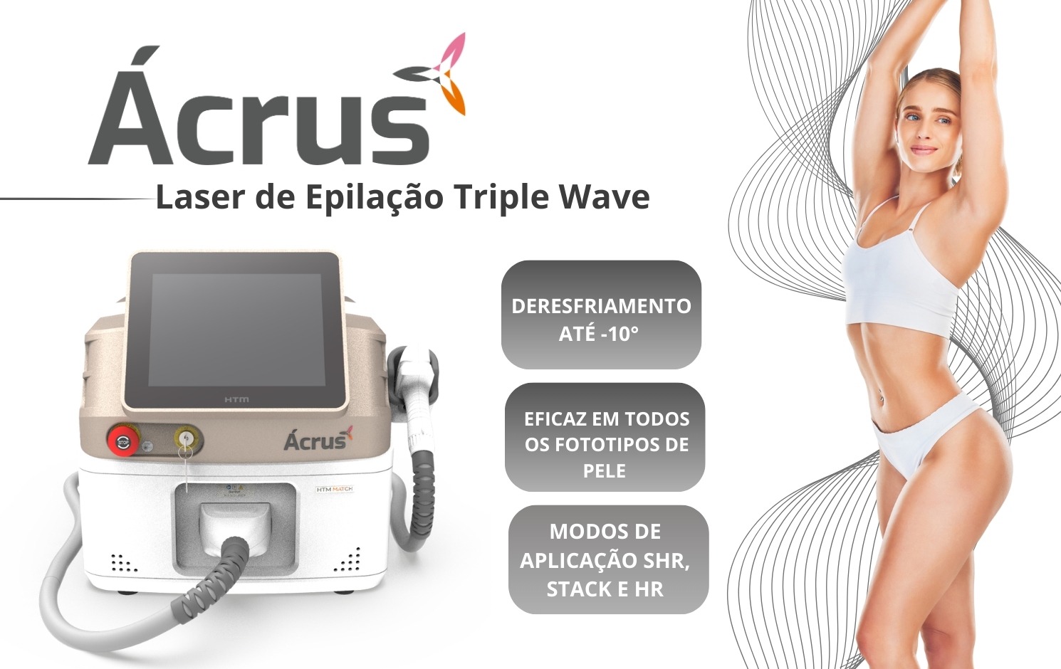 O Ácrus da HTM Eletrônica não é apenas um equipamento de laser, é a solução mais versátil e rentável do mercado de estética atual. Projetado com a exclusiva tecnologia Triple Wave, ele emite três comprimentos de onda simultaneamente (755nm, 808nm e 1064nm). Isso significa que você consegue atingir desde pelos claros e superficiais até os mais escuros e profundos, tratando com segurança absoluta todos os fototipos de pele (I ao VI)