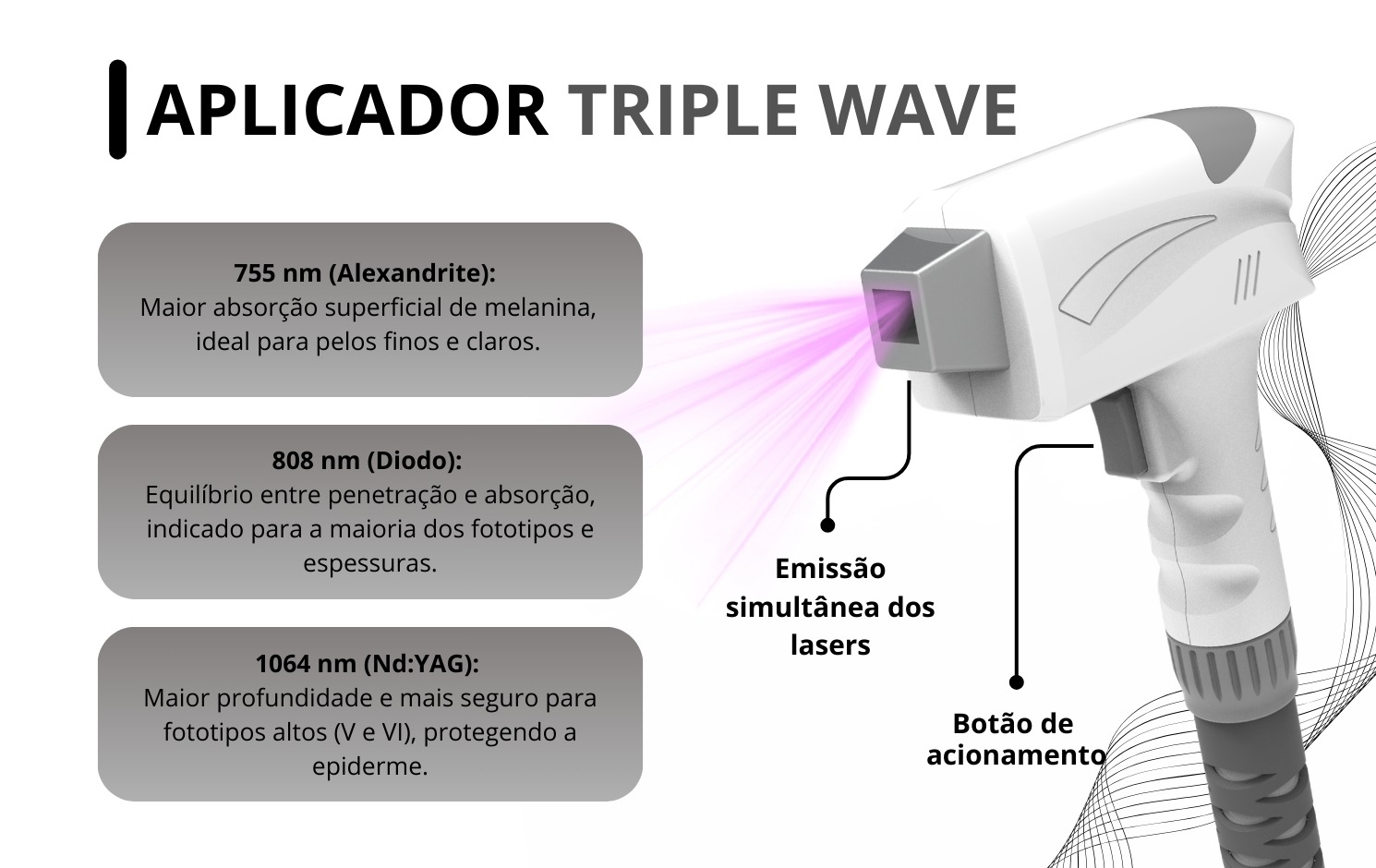 O Aplicador LASER Triple Wave é o grande destaque do Ácrus e representa o que há de mais avançado na tecnologia de depilação a laser. Sua engenharia óptica emite simultaneamente três comprimentos de onda (755nm, 808nm e 1064nm), permitindo atingir diferentes profundidades do folículo piloso em um único disparo.